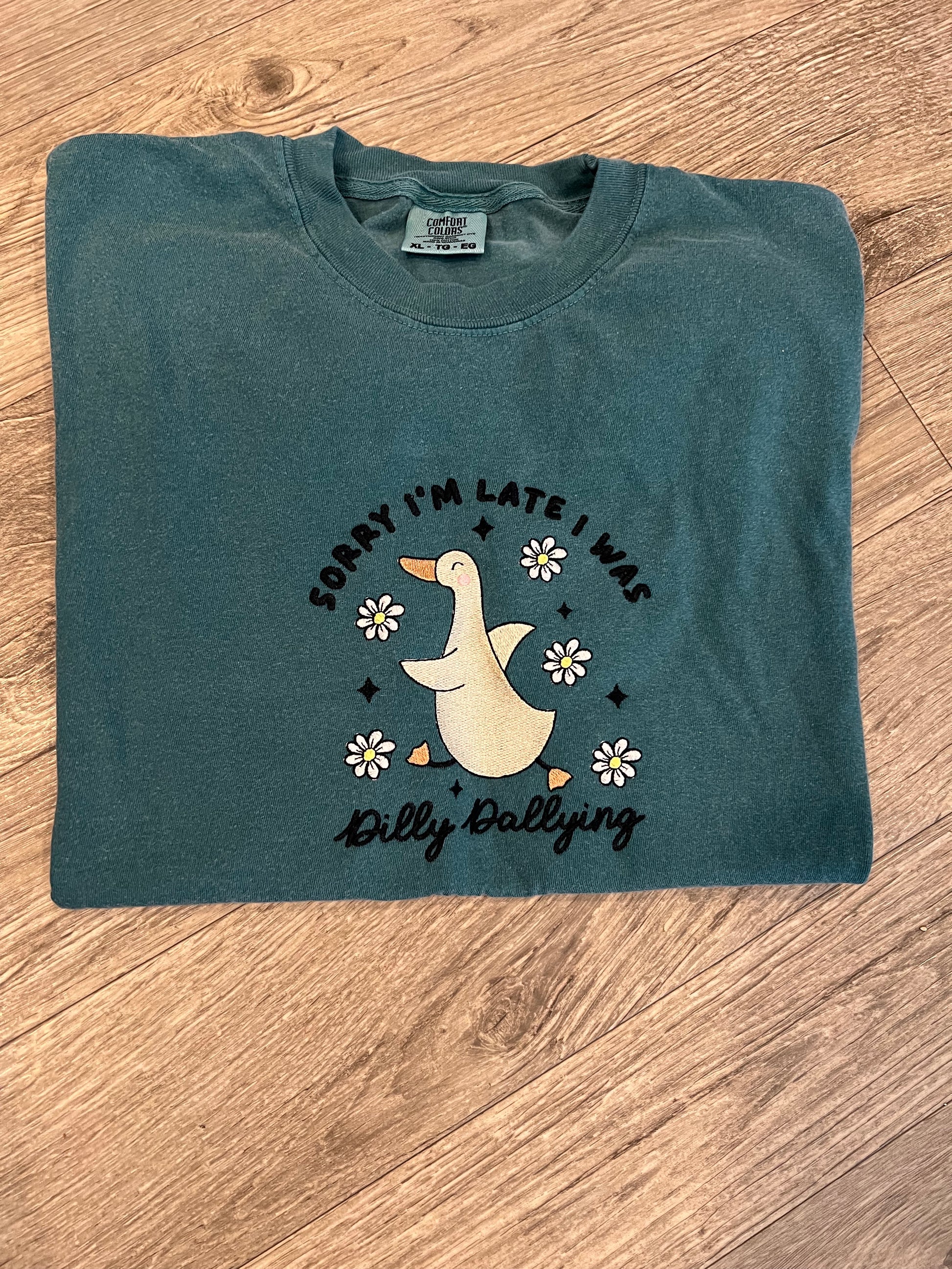 Dilly Dally Goose is embroidered center chest on emerald colored shirt.
