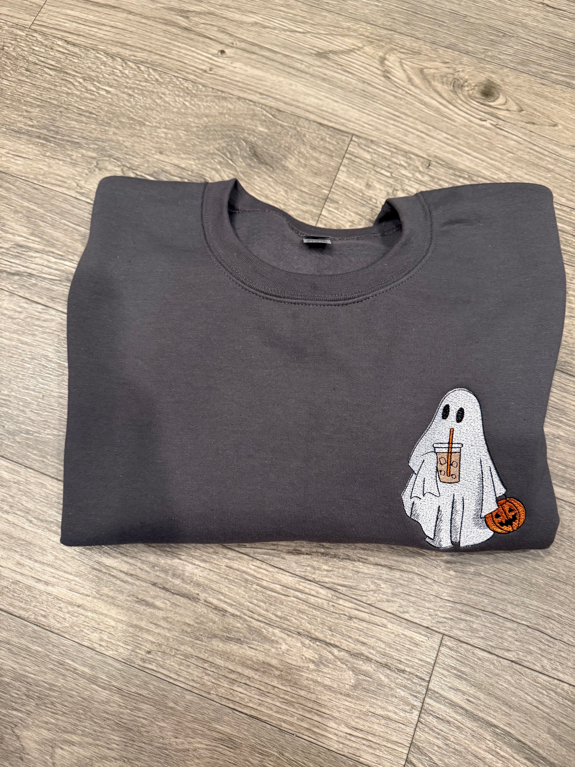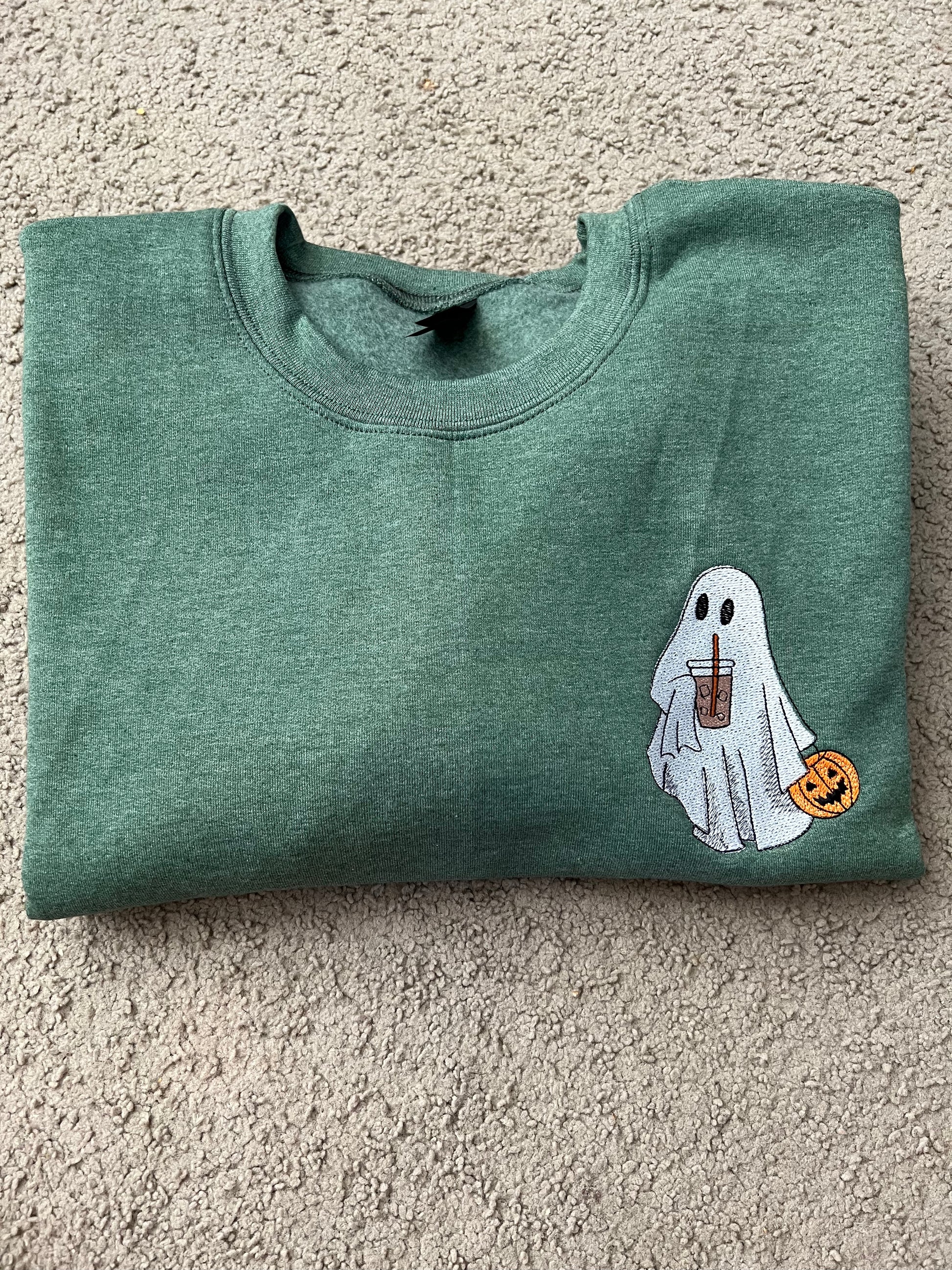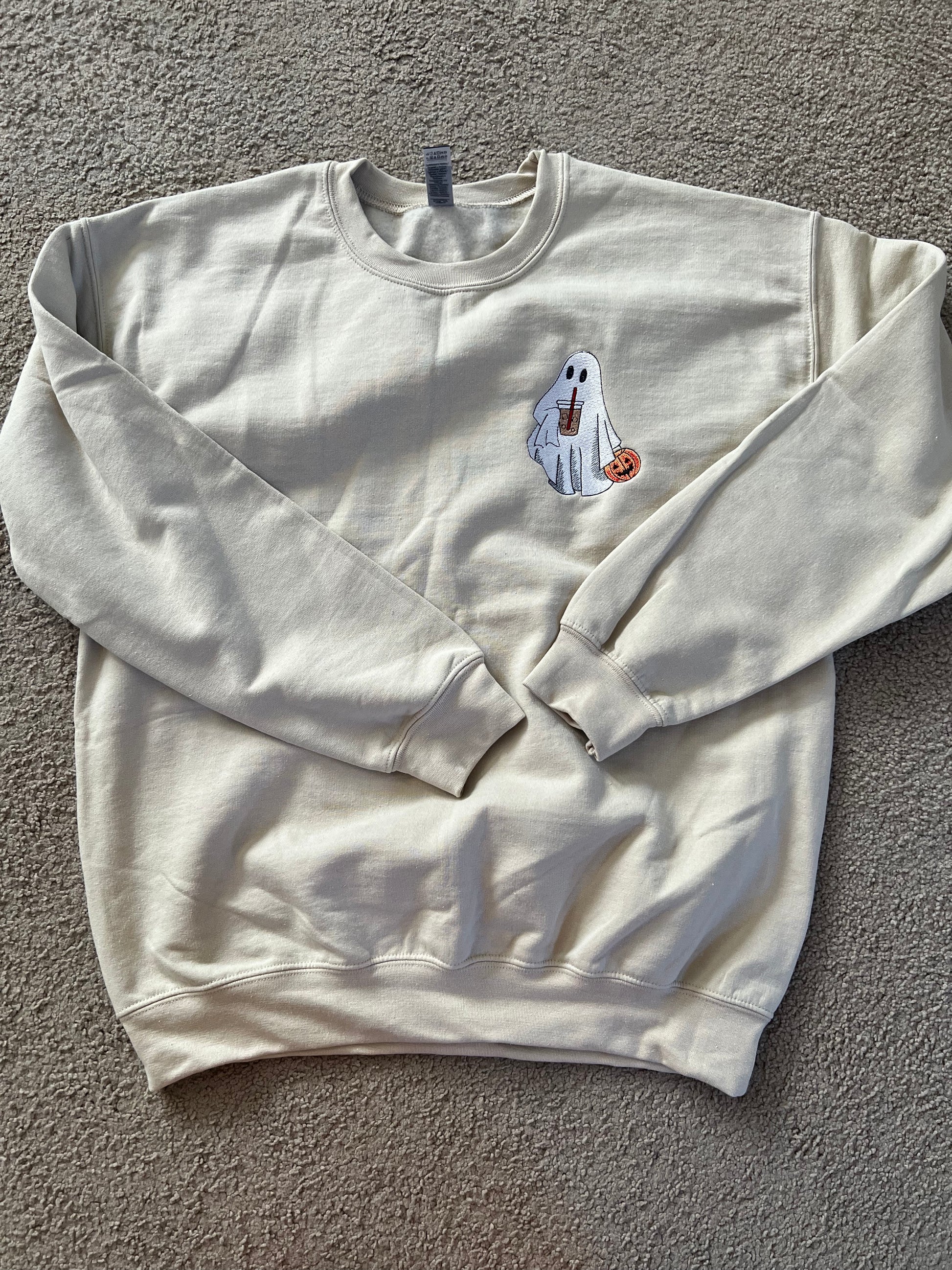 Ghost with Coffee Cup and Pale Embroidered Sweatshirt