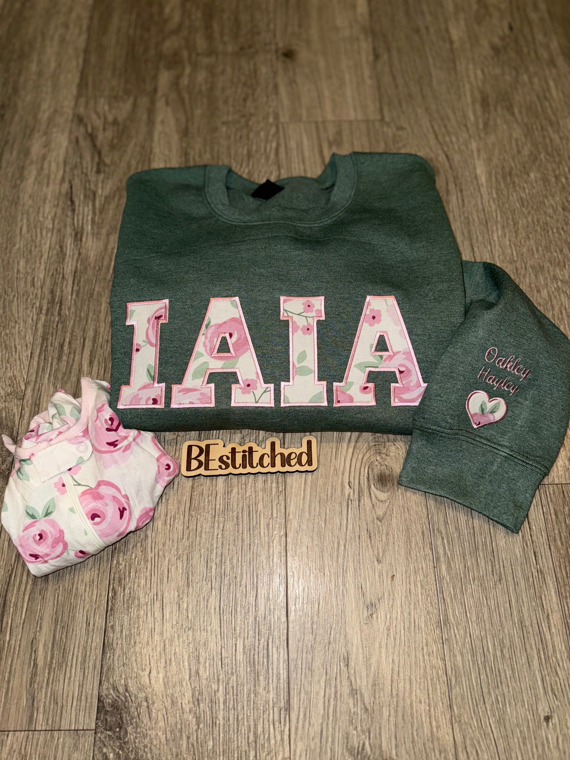 Sleeve embroidery is addition costs* please make sure you list name(s) or dates that you want listed above heart. The heart is from one of the fabrics you provide. Please indicate which one if you are sending in multiple.
