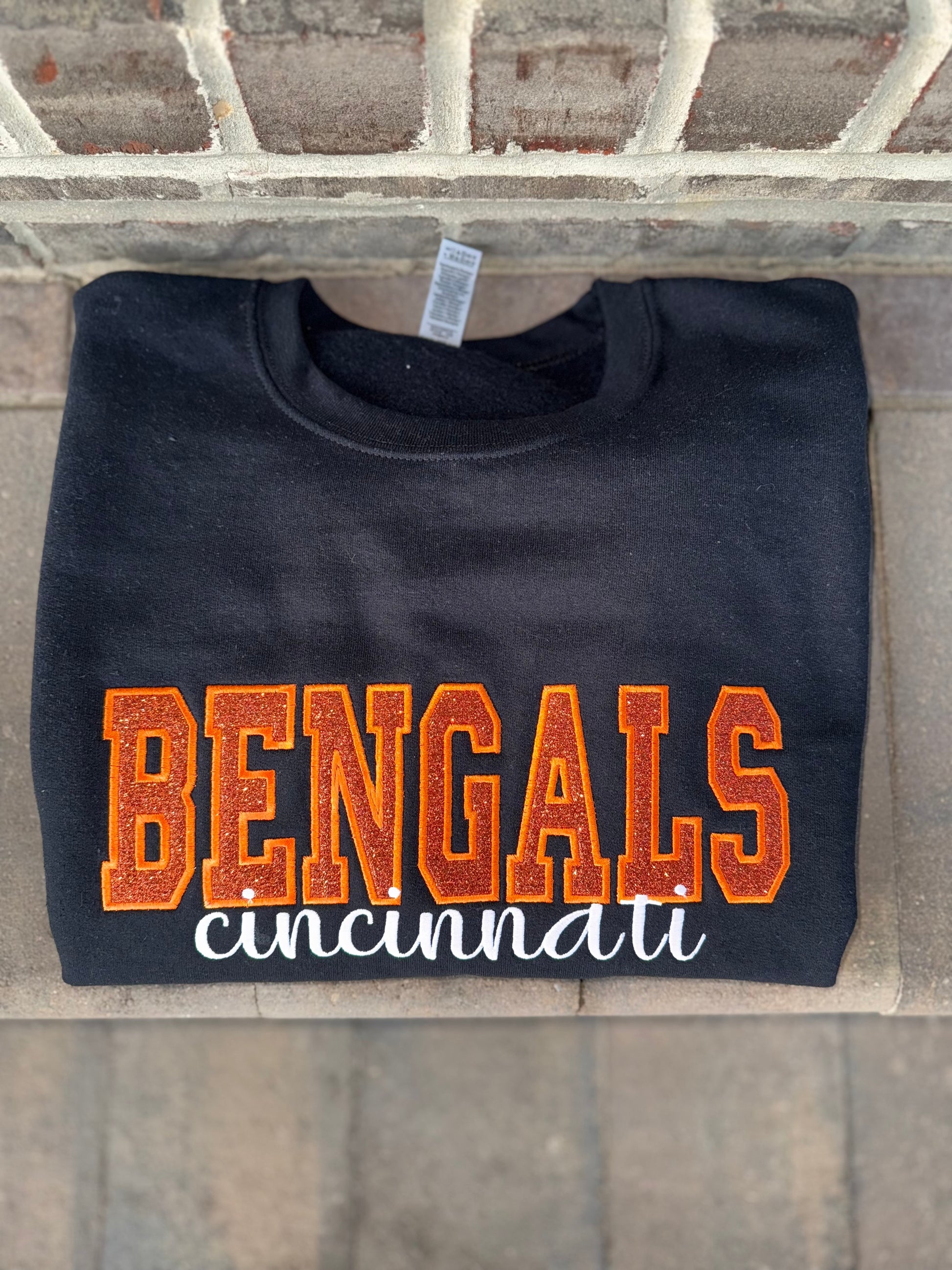 Sports team "Bengals" is applique orange glitter with orange thread. The Cinci is done with white thread on a black sweatshirt.